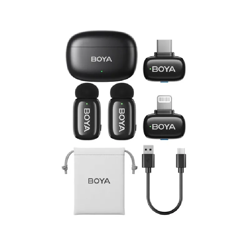 Designed with unmatched portability for the content creator on the go, the black BOYA mini 2-Person Tiny Wireless Microphone System features ultracompact transmitters weighing just 0.2 oz while improving your audio quality in your next vlog or livestream. The system includes two clip-on transmitters with built-in microphones, two plug-in receivers with USB-C and Lightning connectors to connect directly to your mobile device, and a charging case. Easily film TikToks, Instagram lives, or YouTube vlogs with two subjects from up to 328′ away. Onboard controls toggle the 3-levels of noise cancellation and voice changer modes.