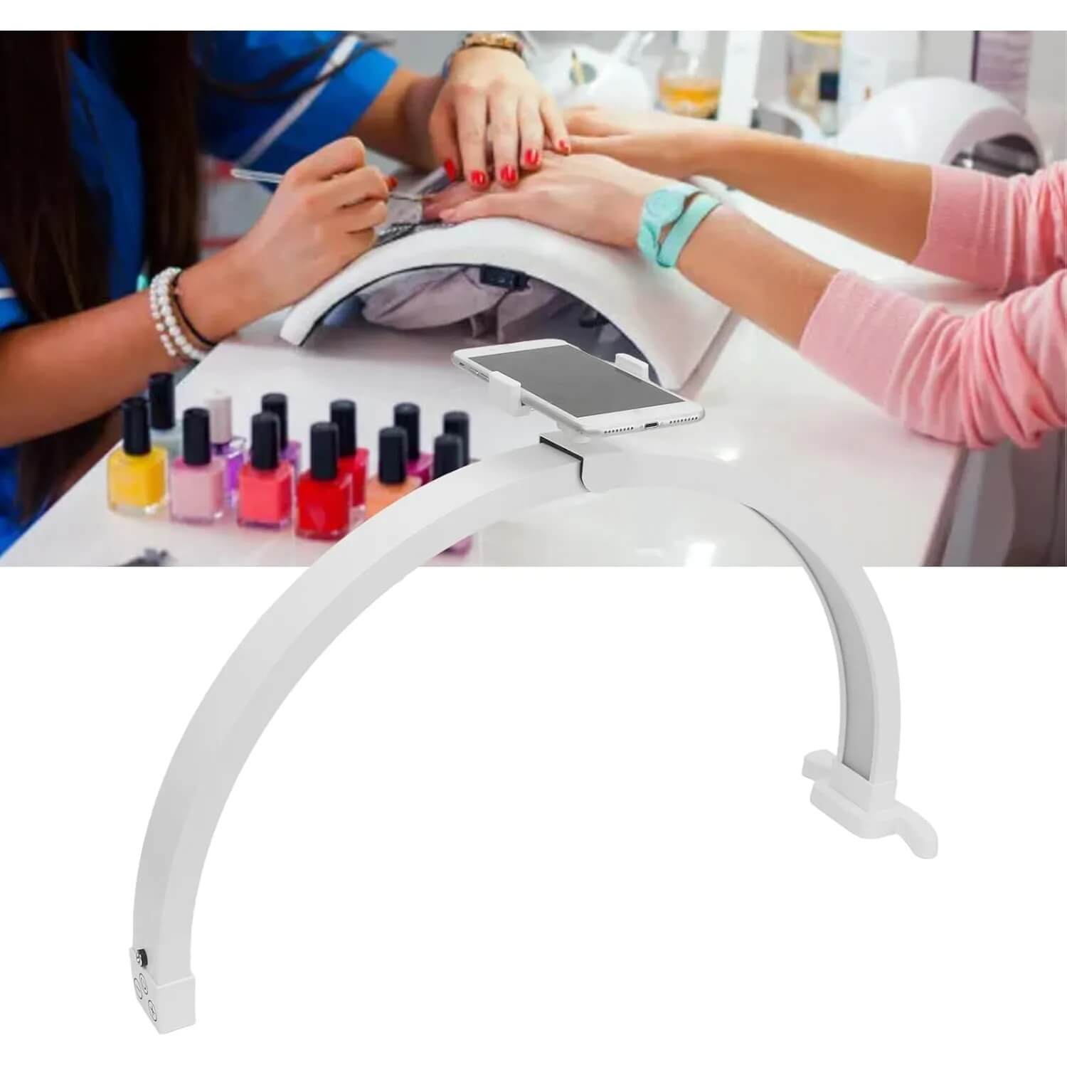 The HD-M13x Half Moon Led Lamp Desktop Light with Phone Clip is a specialized professional lighting instrument meticulously engineered to meet the high-precision requirements of the beauty, tattoo, and dermatological industries. This 22-inch luminaire features a distinctive semi-circular arc design that provides 180 degrees of consistent, shadow-free illumination, which is essential for technicians performing intricate tasks such as eyelash extensions, microblading, and detailed aesthetic treatments. Finished in a sleek white coating, the HD-M13x Half Moon Led Lamp Desktop Light with Phone Clip delivers a potent 1500LM of brightness via 208 strategically placed LED beads, ensuring that every detail of the workstation is visible without causing the glare or hotspots associated with traditional overhead lighting.