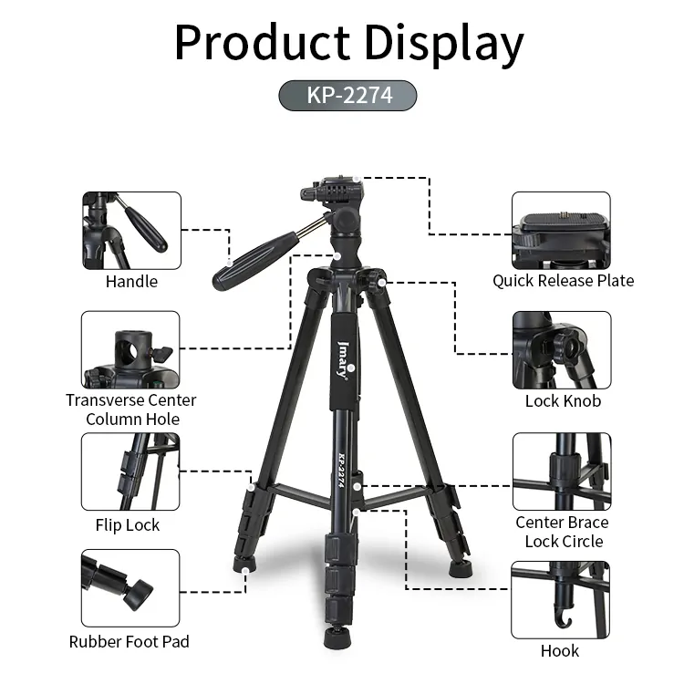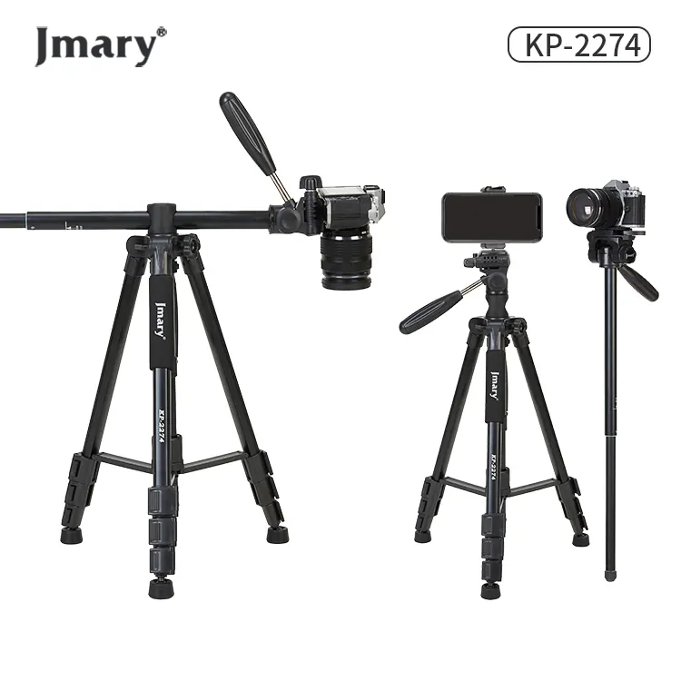 ال Jmary KP-2274 Tripod is a durable and portable tripod designed for both photography and videography. With its 4-section aluminum legs (23mm), it provides excellent stability while remaining lightweight at just 1.5kg.