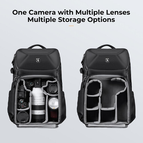 The black, 20L Beta Photography Backpack من K&F Concept is designed to hold and protect your camera and multiple lenses. It has a large main compartment that can be separated into top and bottom sections. This pack has thick, built-in, protective padding and a sturdy supportive frame to keep your gear safe from impact. The high-density and abrasion-resistant fabric also has tear- and water-resistant properties. Multiple pockets hold your SD cards, cables, batteries, and more. A side pocket stores your tripod and the rear of the main compartment holds a 15.6″ laptop. The thick rear panel has breathable and soft fabric. The ergonomic design increases airflow when you are hiking or traveling while evenly distributing the pack’s weight.
