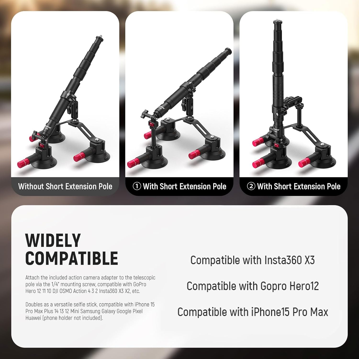 • Triple Suction Cup Car Mount Kit– Capture immersive POV (point of view) footage from unique driving angles like your engine hood, windshield inside/outside, car dash, or car side. The suction cup camera mount stand holder securely attaches your action camera with three powerful suction cups, and enables flexible positioning with extension poles and a ball head magic arm for video recording, with a safety lanyard for added safety. Note to use at speeds below 80 km/h to prevent accidental drops
