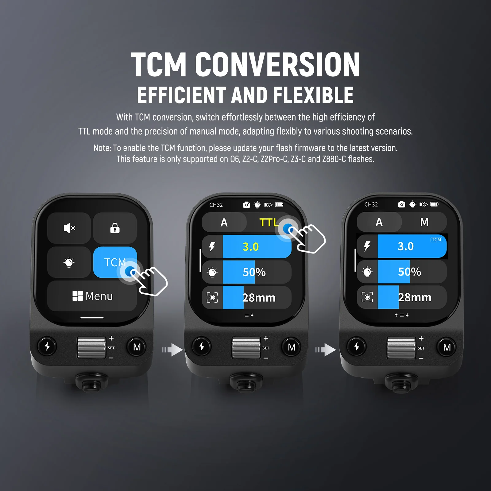 • Multiple Flash Modes– With TTL, M/Manual, and Strobe Modes, the flash trigger supports ±3 EV exposure compensation, while the Manual mode offers precise flash output adjustments from 1/128 to 1/1, with the S1/S2 optical slave mode (only available in Manual Mode) for wireless triggering. Also with zoom settings, auto or manual, adjustable from 20mm to 200mm, and supports single point triggering for precise control over your shots
