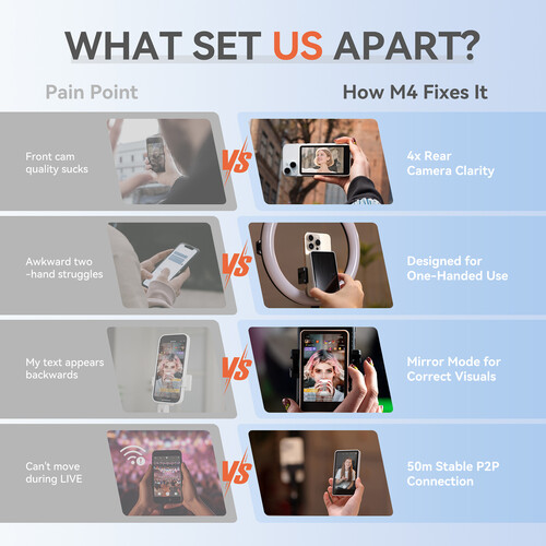 The M4 is designed for creators who shoot solo, and it delivers up to 3 hours of uninterrupted operation. It has an optimized low-power system to ensure long runtime and stable performance without overheating. It has silent operation for ASMR clarity, and a built-in speaker with adjustable volume for playback. The stylish black design compliments any smartphone or smartphone case.