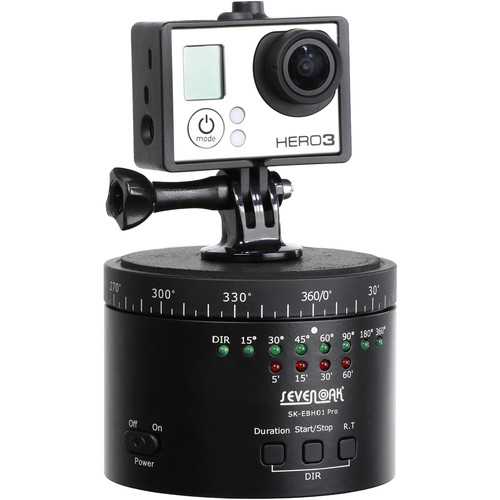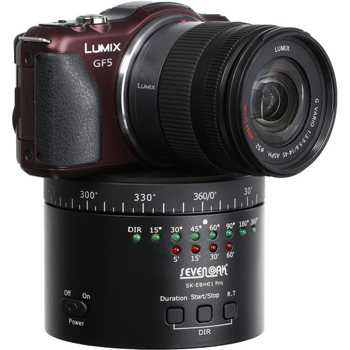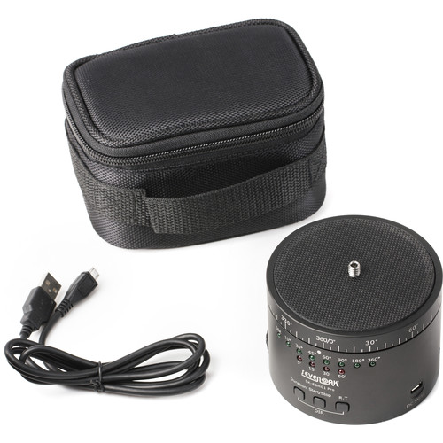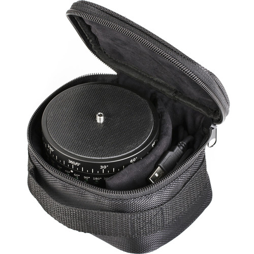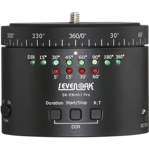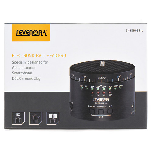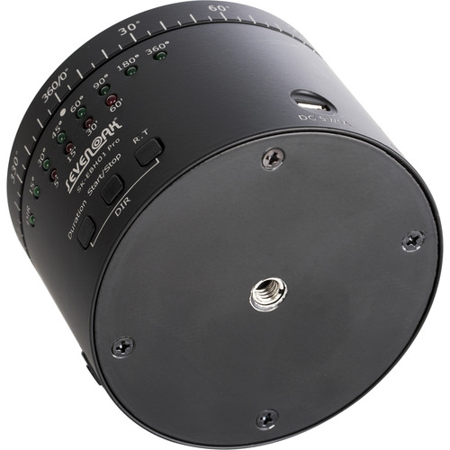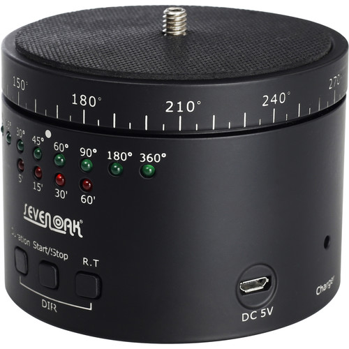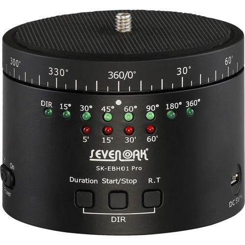 ال Sevenoak Pro Electronic Time Lapse/Panoramic Head is a tripod-mountable turntable base that lets you capture panning time-lapse videos and panoramic photo sequences. The head offers a total of seven rotation angles, ranging from 15 to 360°, and time duration periods of 5, 15, 30, and 60 minutes. Motion can be set for clockwise or counterclockwise rotation. For camera attachment, the head features a standard 1/4″-20 screw, letting you capture time-lapse videos using a range of devices. The head is powered using an internal battery that provides up to six hours of operation per charge. A USB power connection allows for longer runtimes and for charging the internal battery.