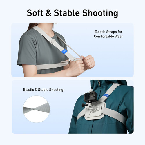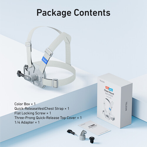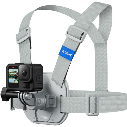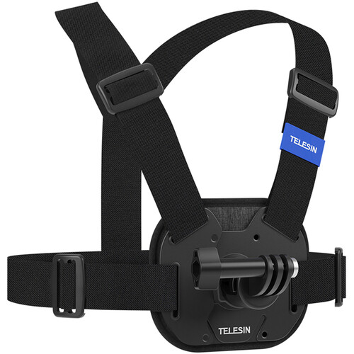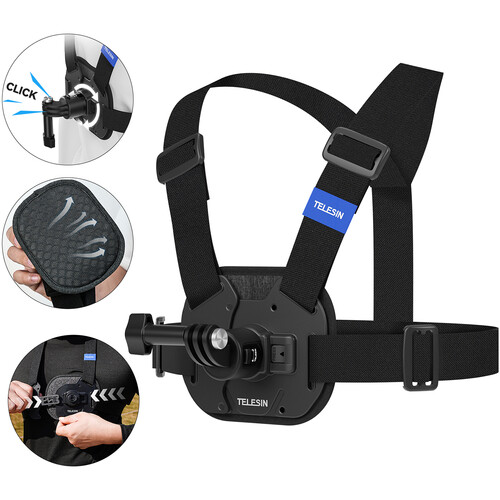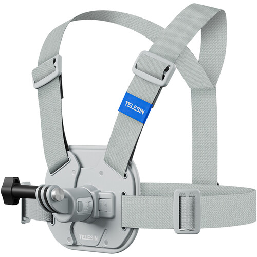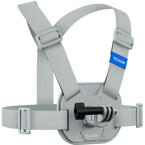 This strap is styled like a vest and loops around your chest and over your shoulders. It is fully adjustable to comfortably fit most body sizes. The chest plate features a quick release mounting interface with a curved 3-prong action camera mount for easy mounting and unmounting. A 2-prong to 1/4″-20 screw adapter is included for additional compatibility.