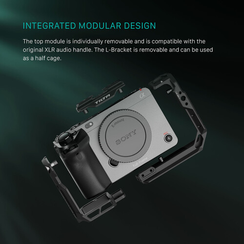 The cage can be configured for both full cage protection and a lighter-weight half cage form for gimbal use. The top module is individually removable and is compatible with the original XLR audio handle. The L-Bracket is removable and can be used as a half cage.