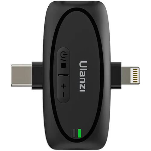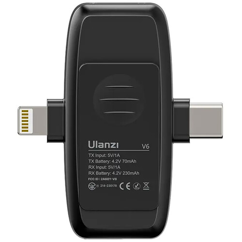 the V6 3-in-1 2-Person Plug-and-Play Wireless Lavalier Microphone System من أولانزي. This 2.4 GHz wireless lavalier microphone system features low-latency audio transmission without the need for setup, Bluetooth, or a wireless app. The set includes two omnidirectional microphone transmitters and a receiver and is designed for use with smartphones, tablets, and cameras.