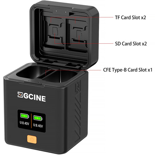 Fast charge two Canon LP-E6/E6N/E6NH/E6P batteries at 8.4V simultaneously with the ZGCINE Fast Dual Charger. Input power through the USB-C PD port with the included USB-C cable, and check charging progress on the convenient 0.96″ OLED display. The charger also features slots for memory card storage, including two slots for microSD cards, two slots for SD cards, and one dedicated slot for a CFE type-B card between the batteries.