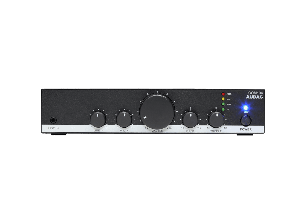 The COM104 is a compact but versatile public address mixing amplifier which offers solutions for small to medium size audio systems in commercial installations. Typical applications are background music systems in retail stores, bars, restaurants and office buildings.
