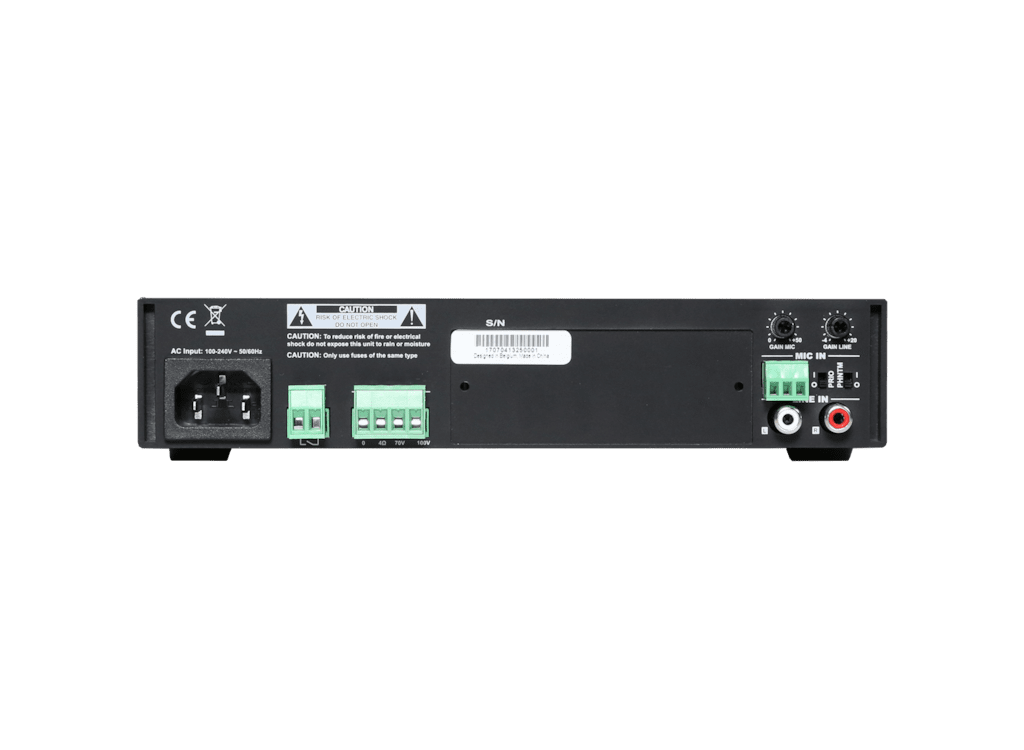 The amplifier is designed using Class-D amplifier technology and delivers an output power of 40 Watt to constant voltage (100V and 70V) or low impedance (4 Ohm) audio systems. A switch mode power supply allows compatibility with a wide variation of mains voltages for global compatibility.