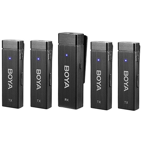 Record two-person or four-person vlogs and interviews to your DSLR/mirrorless camera or compatible smartphone using the BOYA BY-W4 Ultracompact 4-Person Wireless Microphone System and its four included transmitters with built-in omnidirectional microphones. The system not only includes these four transmitters with ultracompact form factor and back clips for attaching to your talent’s lapel, but it also includes a four-channel receiver with 3.5MM TRRS connectivity. All of the components can communicate from up to 98′ away via 2.4 GHz frequency.