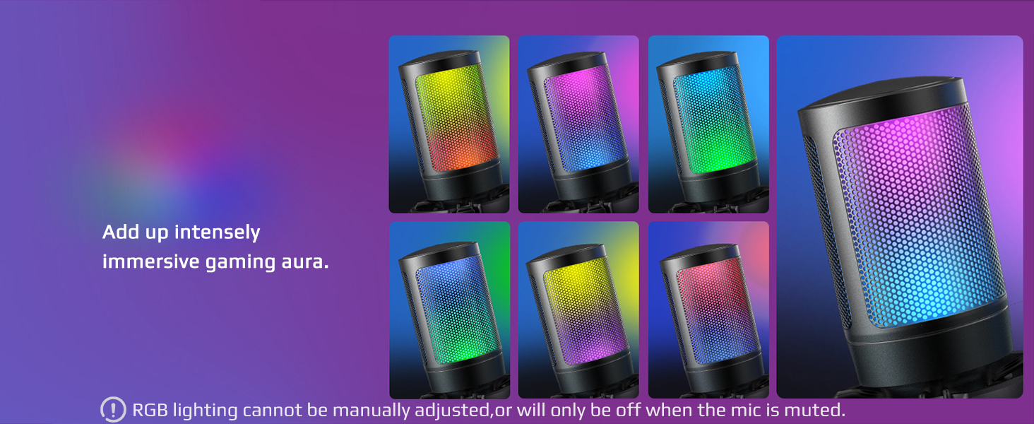 • Quick Mute Button, Handy Gain Knob:  Immediately silence the USB microphone with a tap, preventing emotional outbursts to maintain a positive team atmosphere. RGB off when muted to indicate status and prevent streaming accidents. Mic volume control conveniently located on the condenser microphone is intuitive to use. You can speak at a comfortable level without shouting or whispering during game.