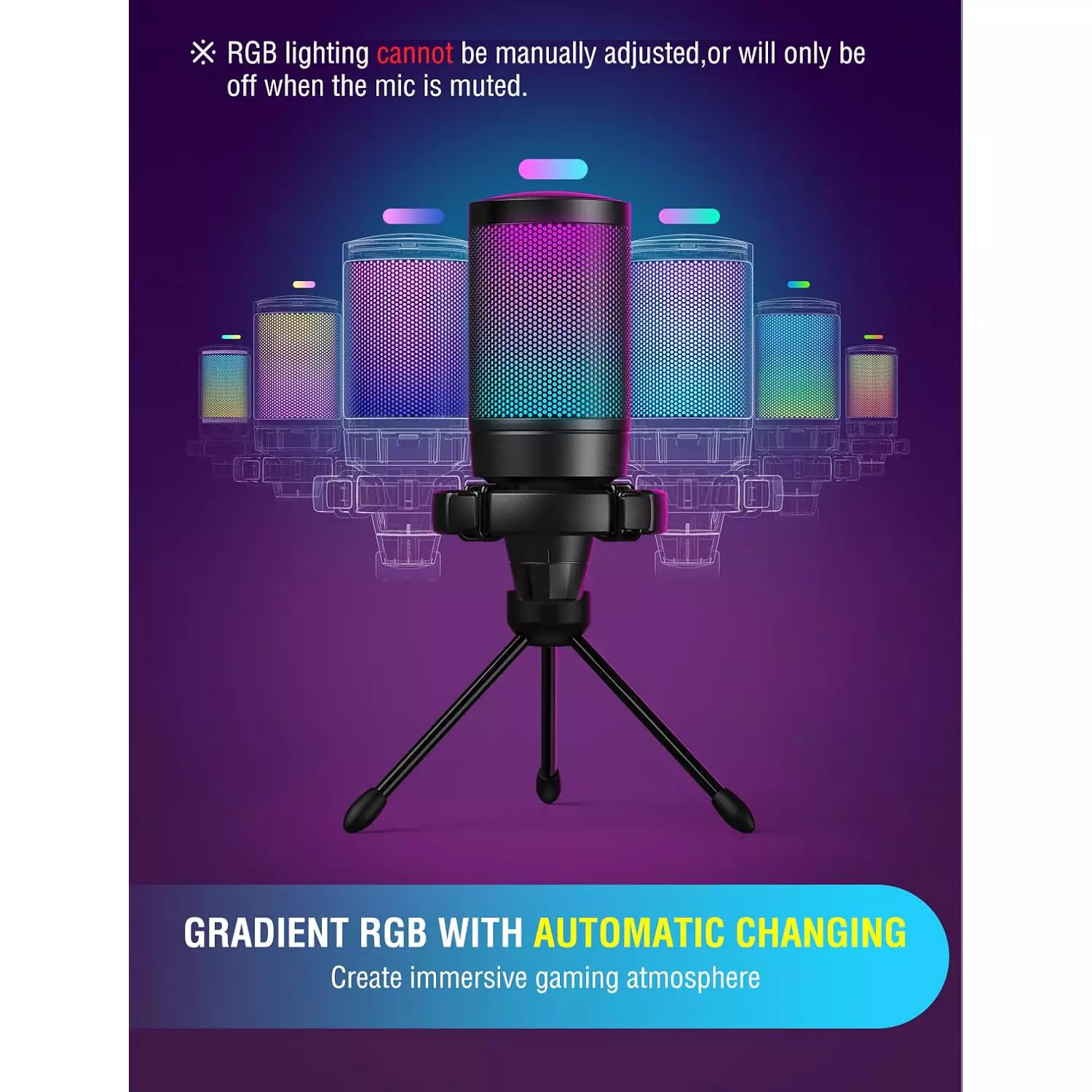 • Gradient RGB:  Bicolored RGB cycles through 7 gradient colors automatically. Vivid lighting on the FIFINE microphone for PC enhances your glowing rig for a carnival atmosphere, immersing you in the intense game arena. The computer microphone for desktop with fixed light modes achieves a personalized experience without visual clutter, randomly matching game characters for surprise color combos.