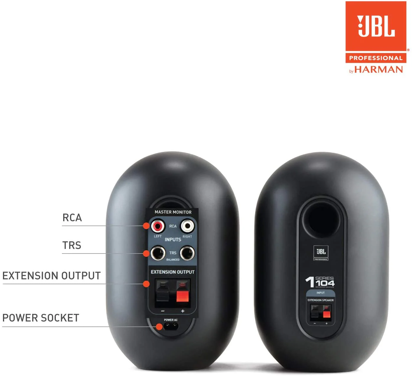 JBL 104 (104SET-BT-US) compact, full-range, powered reference monitors draw from seven decades of JBL Professional engineering to deliver the truest, most accurate sonic presentation of any monitor in their class. Ideal for home recording enthusiasts, podcasters and video producers, as well as professionals seeking accurate portable reference monitors, JBL 104s combine powerful 4.5-inch (118 mm) low-frequency drivers with coaxial .75- inch (19 mm) soft-dome tweeters, potent 60-watt amplification and innovative acoustic design to provide exceptional imaging, neutral frequency response and crisp detail in our smallest, most affordable reference monitor yet. With their sleek, elegant design and compact form factor, they’ll make a stunning statement in any home or pro studio while conserving valuable work space. Creative professionals and music lovers alike can count on the JBL 104 to deliver a reliable sonic reference and a truly enjoyable listening experience, all at an attractive price point.