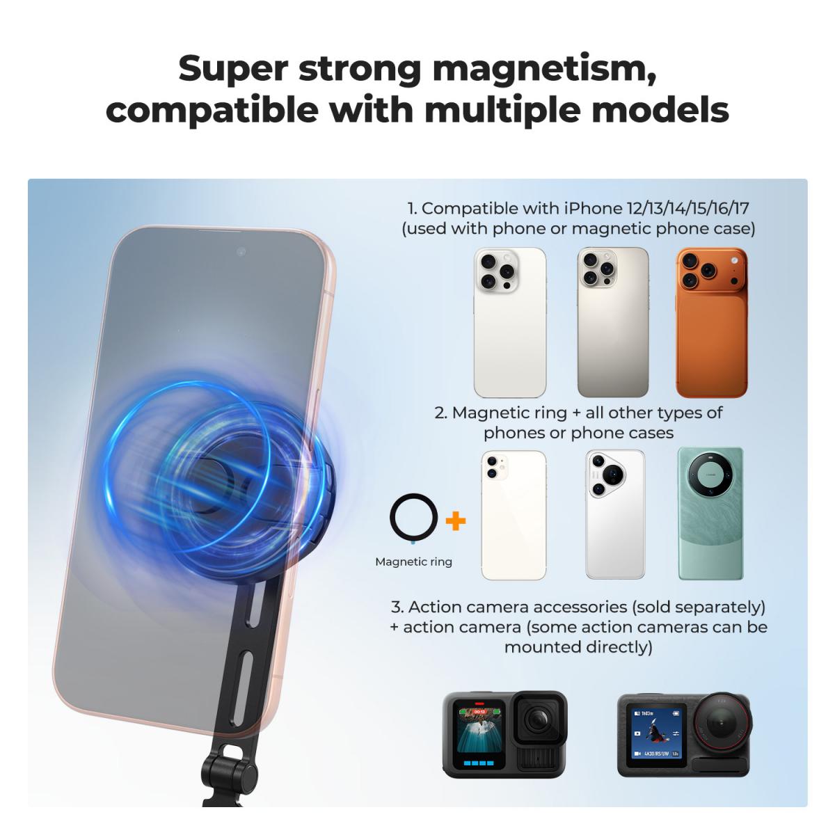 • Wide compatibility with smartphones, MagSafe devices & action cameras