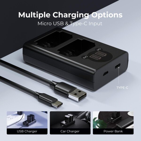 With dual charging slots, this charger lets you charge two batteries simultaneously, reducing downtime and ensuring you’re always ready to shoot. The fast-charging capabilities ensure quick power-ups, even during busy shoots. - Multiple Charging Options for Flexibility