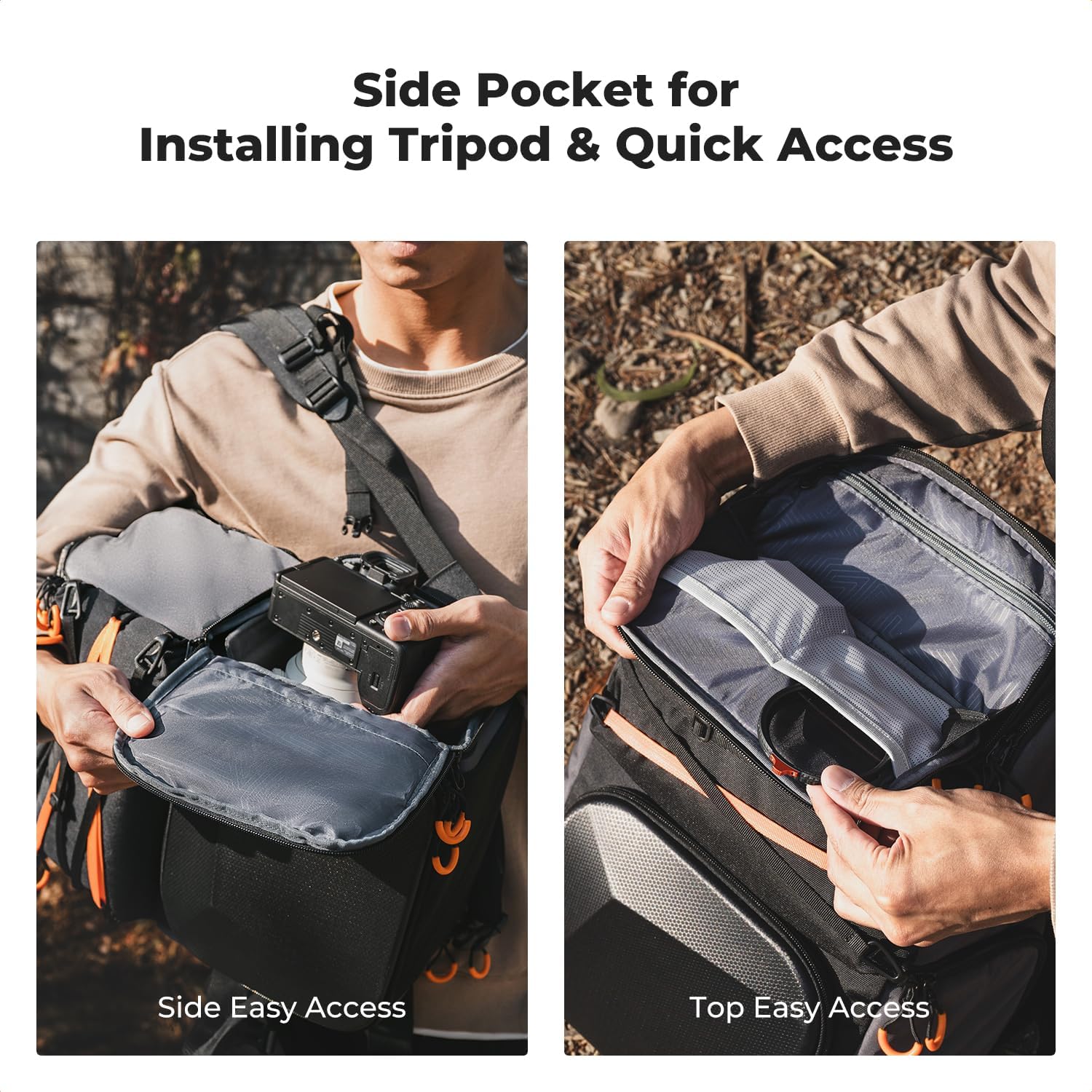 Superior Equipment Protection: The robust front shell offers enhanced impact resistance, crafted from 1200D nylon for water-repellent and weather-resistant protection. Includes a Level 1-2 waterproof rain cover for added security. Efficient Organization and Access: Features secure rear access with a 180° full opening, allowing for easy equipment organization. Customize storage zones to fit up to two cameras and multiple lenses, with DIY layout options for various needs.