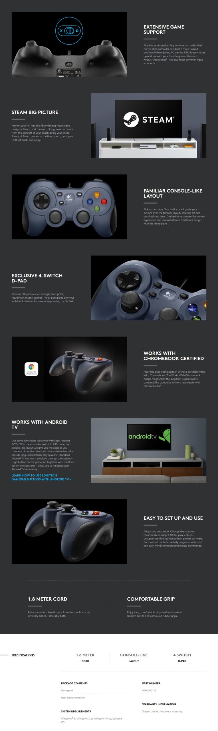 From sports to shooters and anything in between, the Logitech Gamepad F310 brings a familiar console-style experience to your PC, with support for the broadest number of games. Profiler software lets you customise your gamepad with keyboard and mouse inputs. A classic controller design lets you focus on the game. The unique floating design of the D-pad makes it responsive to quick changes in direction. And rubber grips make game play extra comfortable. Requires software installation.
