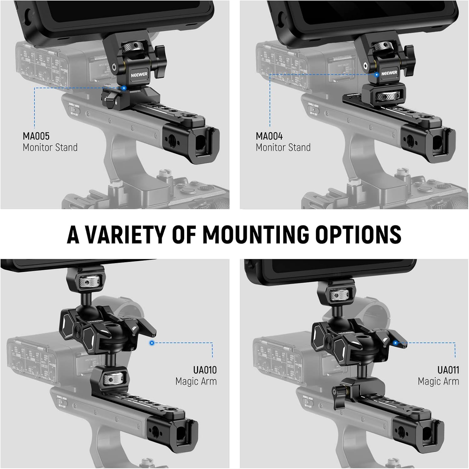 NEEWER CA015 Extension Rig is compatible with Sony XLR Top Handle Unit for FX3 and FX30 cameras. Made of CNC machined aluminum alloy, it weighs only 2.2oz (63g) and is resistant to corrosion, humidity, and abrasion. For a 1.3″ (33mm) extension and a secure yet comfortable grip, attach the extension rig to the handle’s rear through a 1/4″ screw. The included NATO rail, attached to the handle via two 1/4″ screws, provides a quick release mounting interface for monitor mounts, clamps, and other accessories. A cold shoe mount, several 1/4″ and 3/8″ threads, and ARRI locating holes can connect multiple accessories to the handle for better shooting quality and expanded functionality