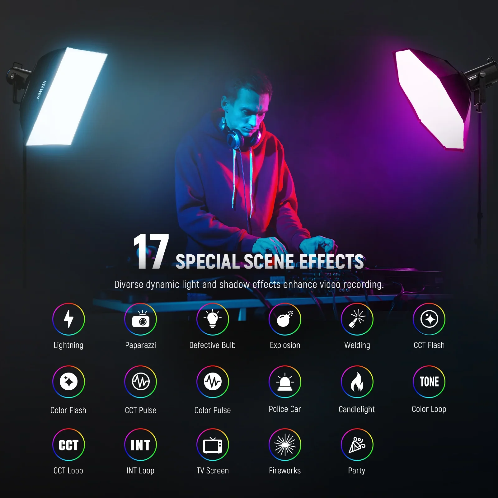 - Advanced RGBWW Lighting &17 Scenes– It features 3 light modes: CCT Mode offers 2500K-7500K extensive bi color lighting, a 0-100% dimming range, and -50/+50 GM correction. HSI Mode offers 36000 colors by 360° angles and 0-100% saturation (90% Rec. 2020 gamut coverage). FX Mode offers 17 preset special scene effects that will make your video creation more realistic