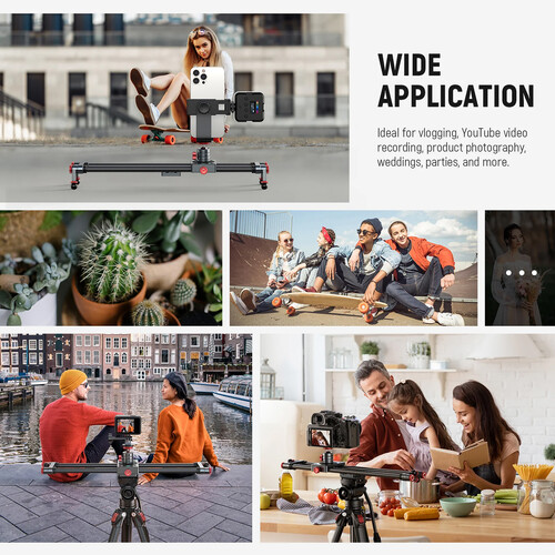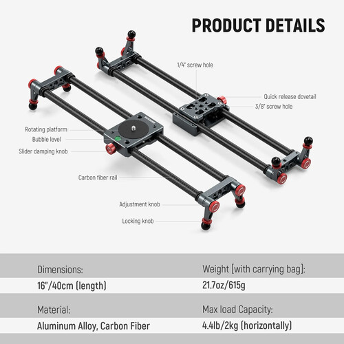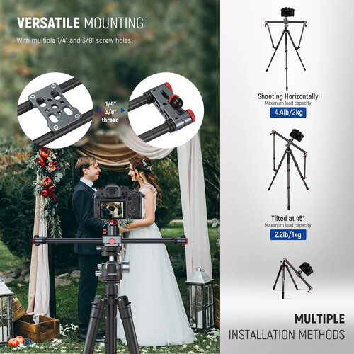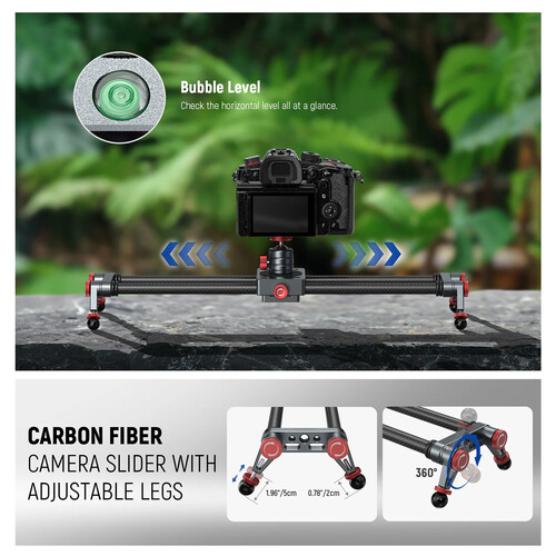 The CS1M Carbon Fiber Track Camera Slider from Neewer is a sturdy camera slider that supports small camera rigs weighing up to 4.4 lb. This manual slider features a smooth, friction-based carriage that can quietly travel up to 16″ across the carbon fiber rails.