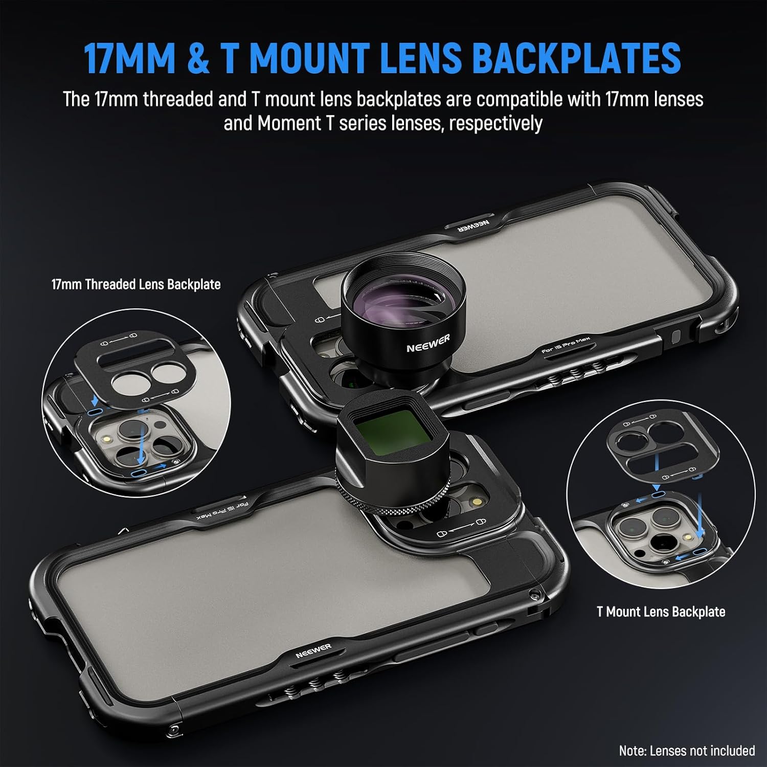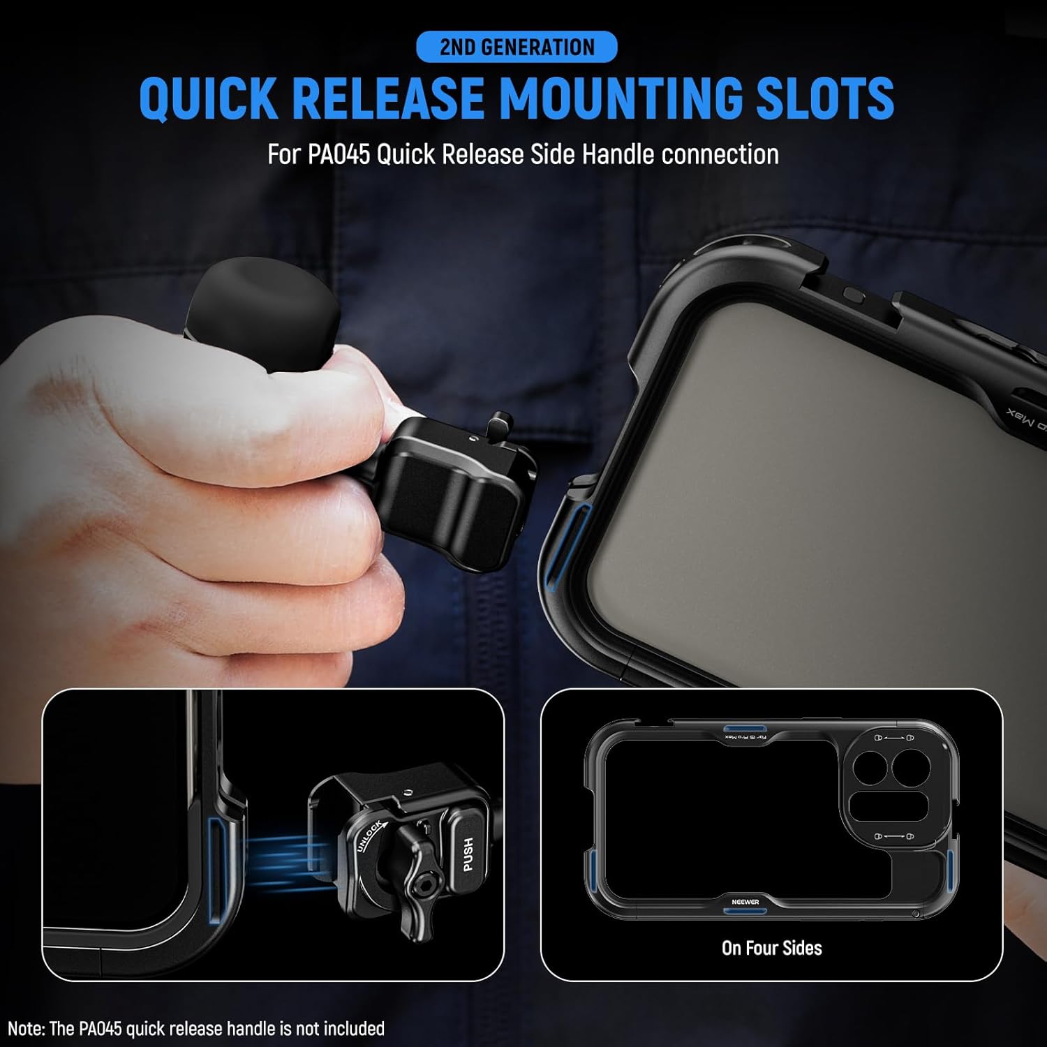 This phone cage is compatible with iPhone 15 Pro Max. It is a versatile, grippy and protective phone stabilizer for smartphone photography, YouTube/TikTok videos, live streaming, video calling and other creative projects. This built-in cage opens and locks with a side button, keeping all the phone’s functions easily accessible and is compatible with MagSafe wireless charging. It has been improved with PA045 Quick Release Side Handle mounting slots and comes with a 67mm filter adapter, a 17mm thread lens back plate and a T Mount lens adapter for a wide range of additional effect filters and lenses. Through 1/4″ threads and cold shoe attachments, you can accessorize this video stand with microphones, LED lights, tripods, shoulder straps and other outstanding NEEWER products.