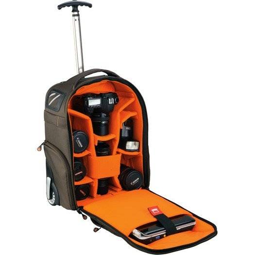 The NEST Athena A90 is a rolling backpack suitable for professional and enthisiast photographers who wish to carry their equipment when travelling. Accommodates a DSLR body with a telephoto lens attached plus an extra 5-6 lenses, a laptop (up to 14″), flashgun and many accessories. Provided with removeable and configurable padded splitters for flexibility of gear storage. Access via zipped opening to front. Side clip locks for attachment of a tripod / monopod.