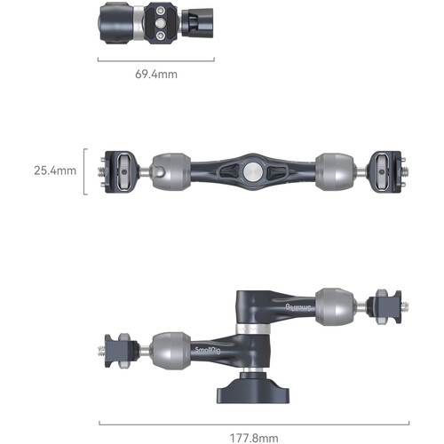 Mount a monitor, light, or accessory onto your camera rig at almost any angle with this 7″ long Magic Arm with Rosette Gear from SmallRig. The aluminum and stainless steel arm features 1/4″-20 thumbscrews on either end. Both ball heads and the center joint are secured using a large center locking lever, and the sections connect by a 360° rotating center rosette joint.