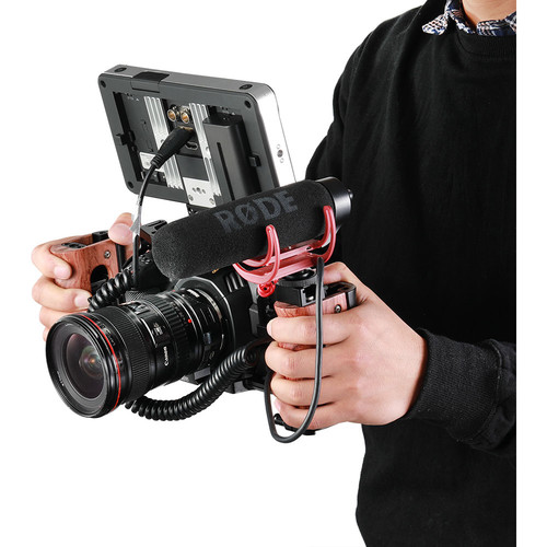 The SSD slides snugly inside the slot and is secured from sliding out with a locking switch on the bottom. The aluminum portion of the grip features multiple 1/4″-20 and 3/8″-16 mounting threads on top for adding accessories such as a monitor, light, or microphone. The wooden portion provides a secure, ergonomic grip.