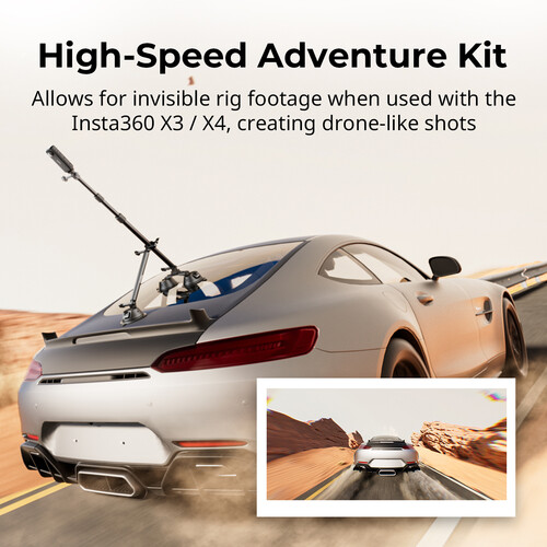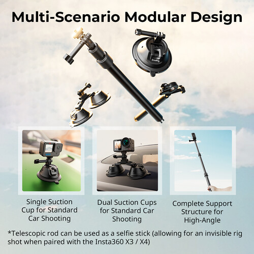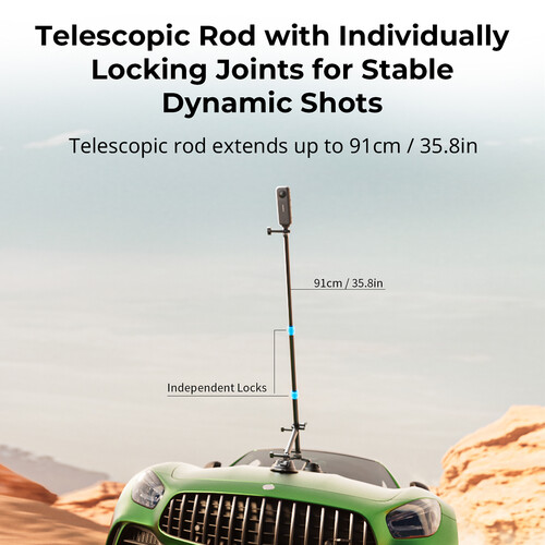 Extend the camera’s distance from the car or snap a selfie with the versatile 35.8″ telescoping extension pole. The included action camera adapters allow the mounting of a small action camera or a 360° camera such as the Insta360 ONE or X series.