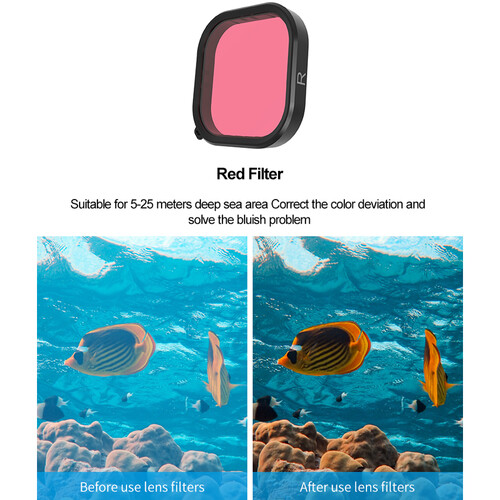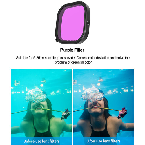 The three filters (purple, red, and magenta) packaged with this kit provide various levels of color correction to minimize bluish and greenish hues during underwater image capturing. A rubber seal provides reliable insulation for the tempered glass lens, which captures clean and crisp images underwater or on land.