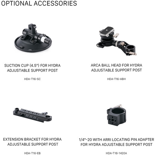 The adjustable post provides mounting for several optional accessories, such as the separately available clamp mount, suction cup, 1/4″-20 adapter ball head Arca-type mount, and more. It provides a 360° swivel for your camera and accessories to fit a variety of shooting styles. A 3-prong action camera mount is included.
