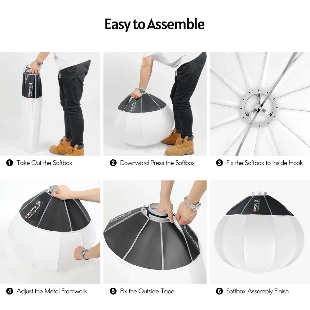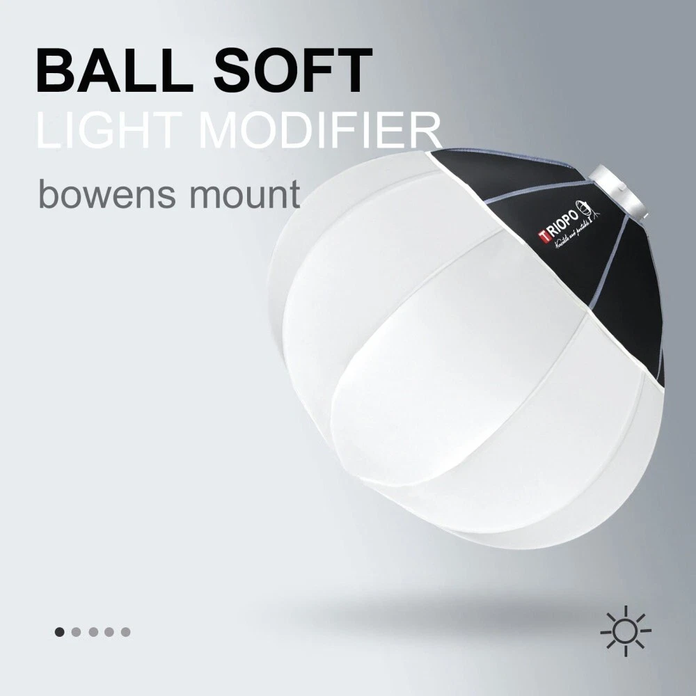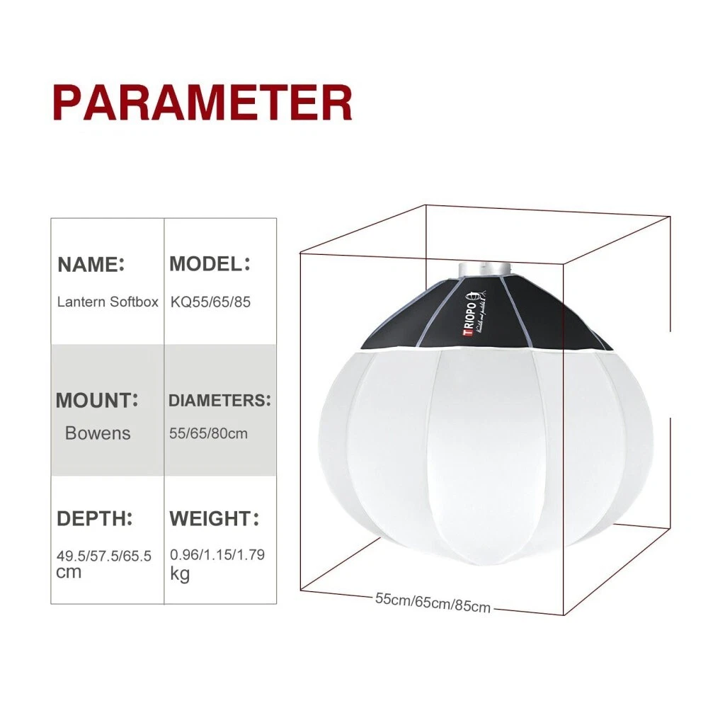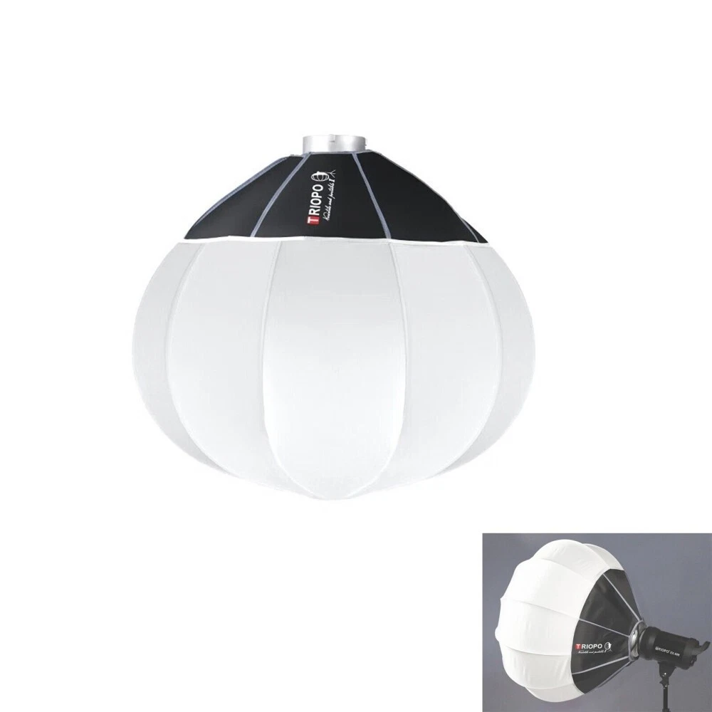 The Triopo KQ55 Lantern Softbox (85cm) is a collapsible omnidirectional lighting modifier designed to produce soft, even illumination across an entire space. Its spherical lantern structure spreads light at 270°, making it ideal for video, livestreaming, filmmaking, and portrait setups.