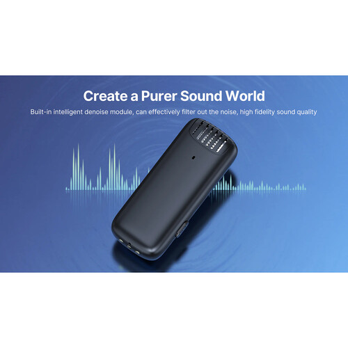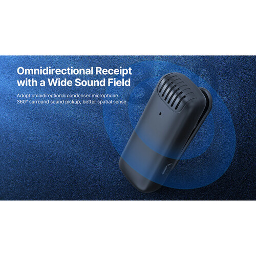 The transmitter mic features a built-in 80mAh battery and is charged using the included charging case that features a 300mAh internal battery that lasts up to 7 hours with enough energy to charge the receiver and transmitter 3-4 times. The wireless receiver is charged via its USB port. The transmitter mic features built-in noise reduction for clear sound.
