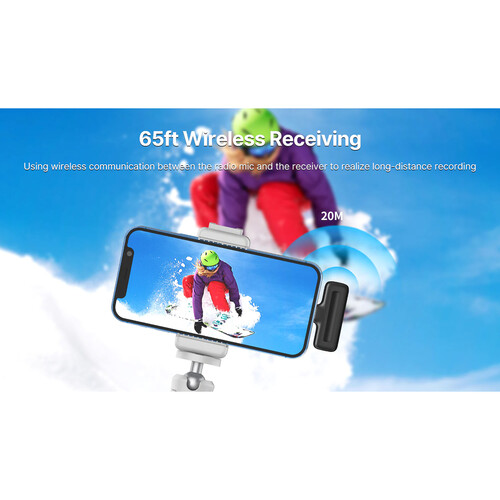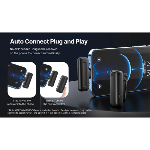 No additional adapters, cables, or Bluetooth required. Just plug the receiver dongle into your smartphone or tablet with a USB-C connector, turn on the microphone power, and it will auto-sync.